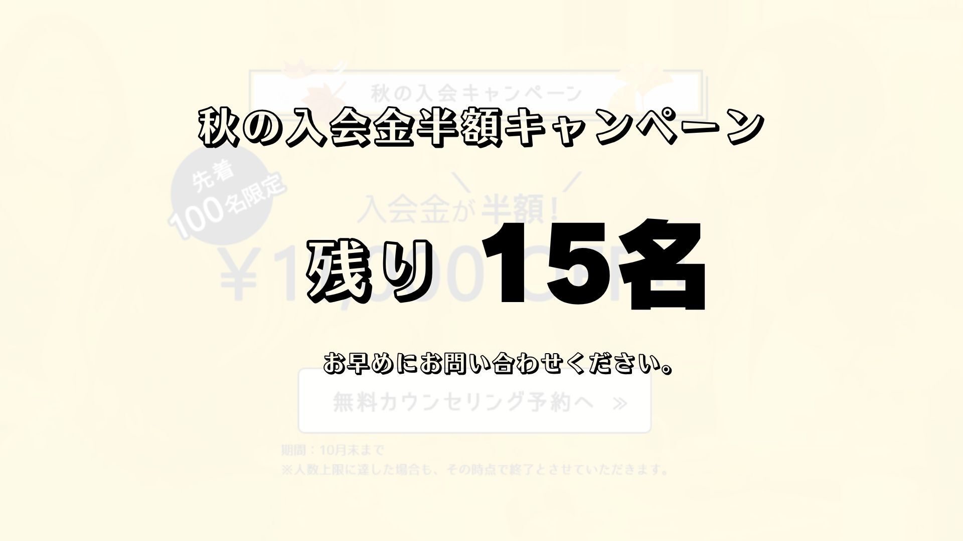 2025年9月1日より実施している、秋の入会金半額キャンペーンですが、大好評をいただいており、ご案内できる枠が「残り15枠」となっております!