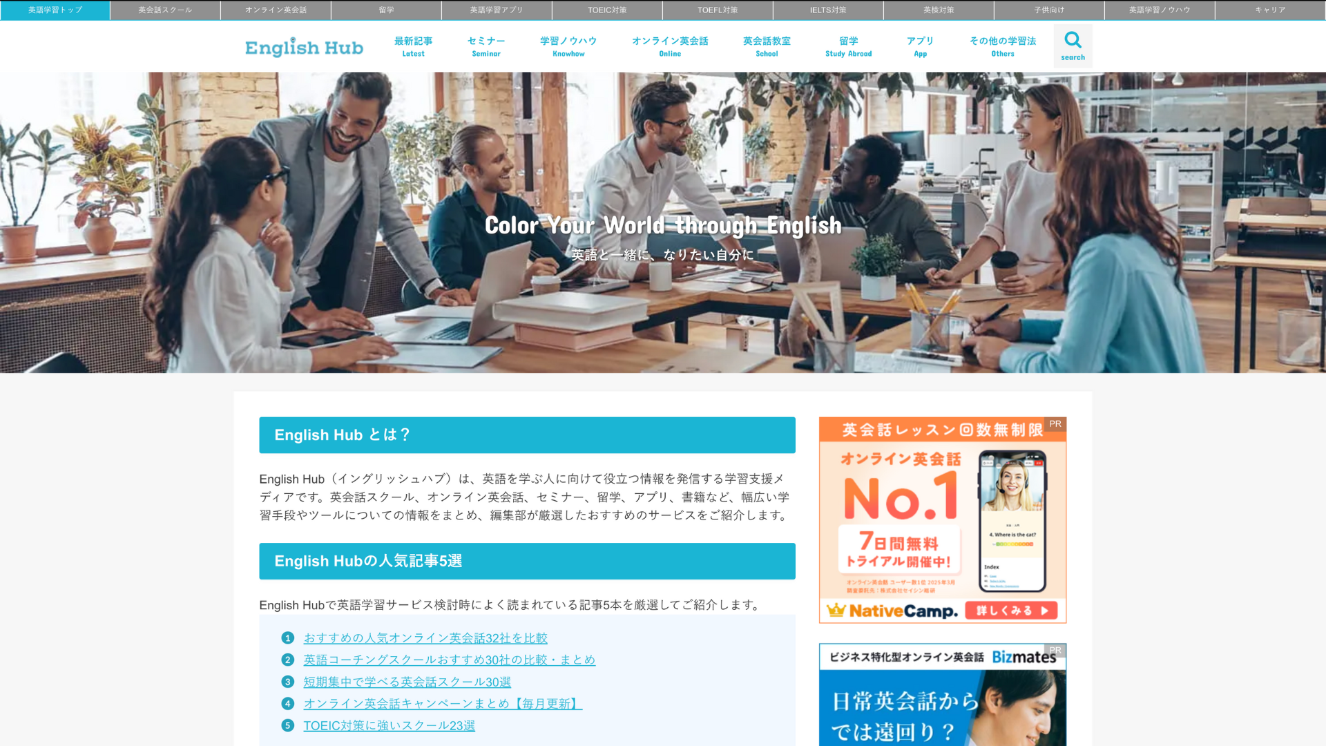 English Hub は、英語学習者向けに全国の英会話スクールやオンライン英会話、英語学習のコツ・教材情報などを幅広く発信する、信頼性の高い情報サイト。実際に学習を検討している方にとって参考になるよう、料金・特徴・学習スタイル・通いやすさなどを丁寧に比較・紹介しているのが特徴です。